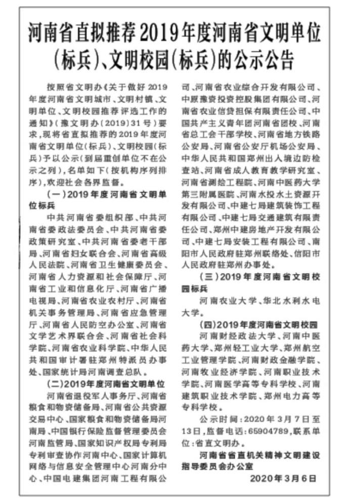 省直文明辦對擬推薦2019年度省級文明單位進行公示 對集團文明單位創建工作給予肯定 2020.03.16